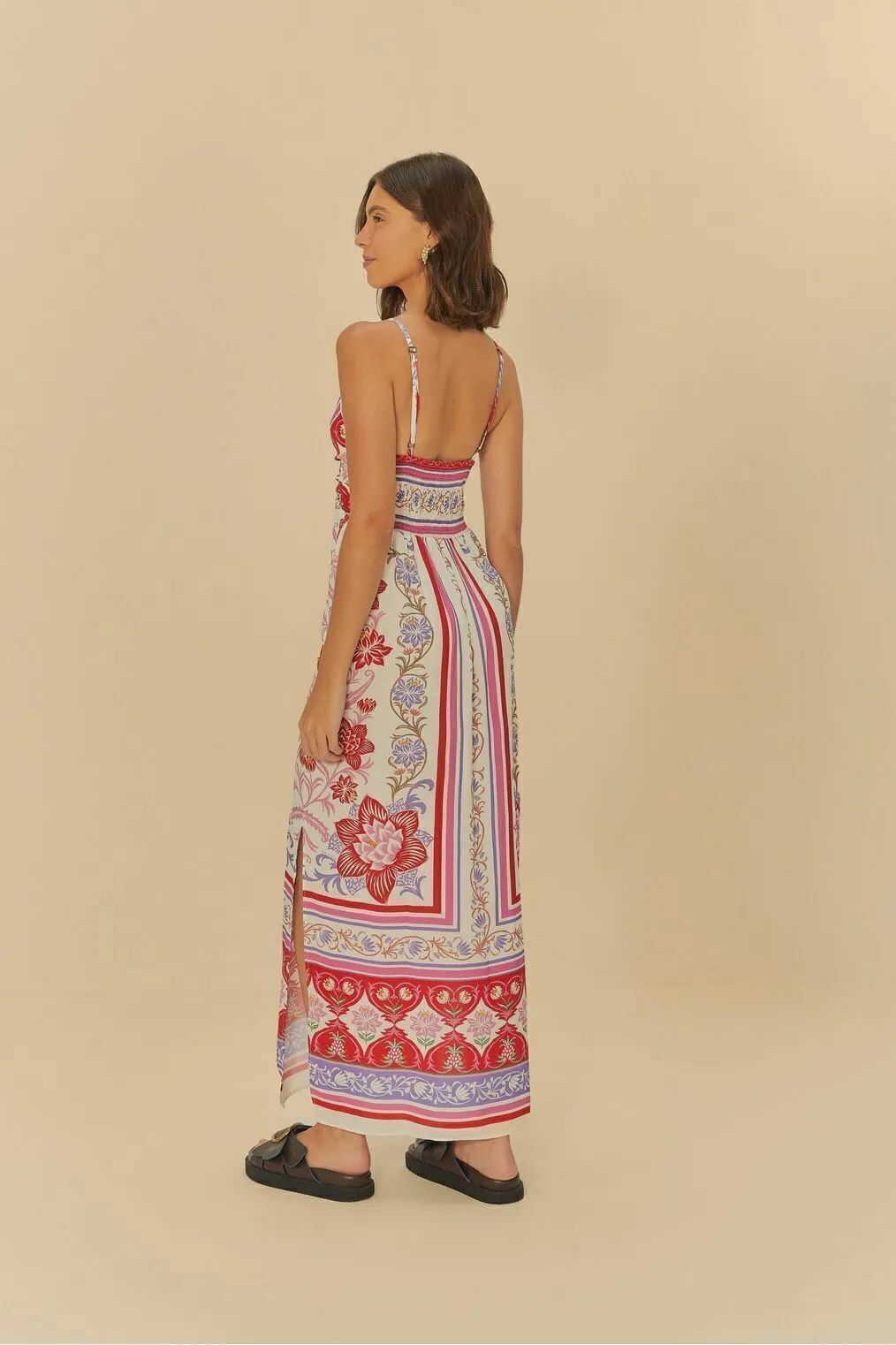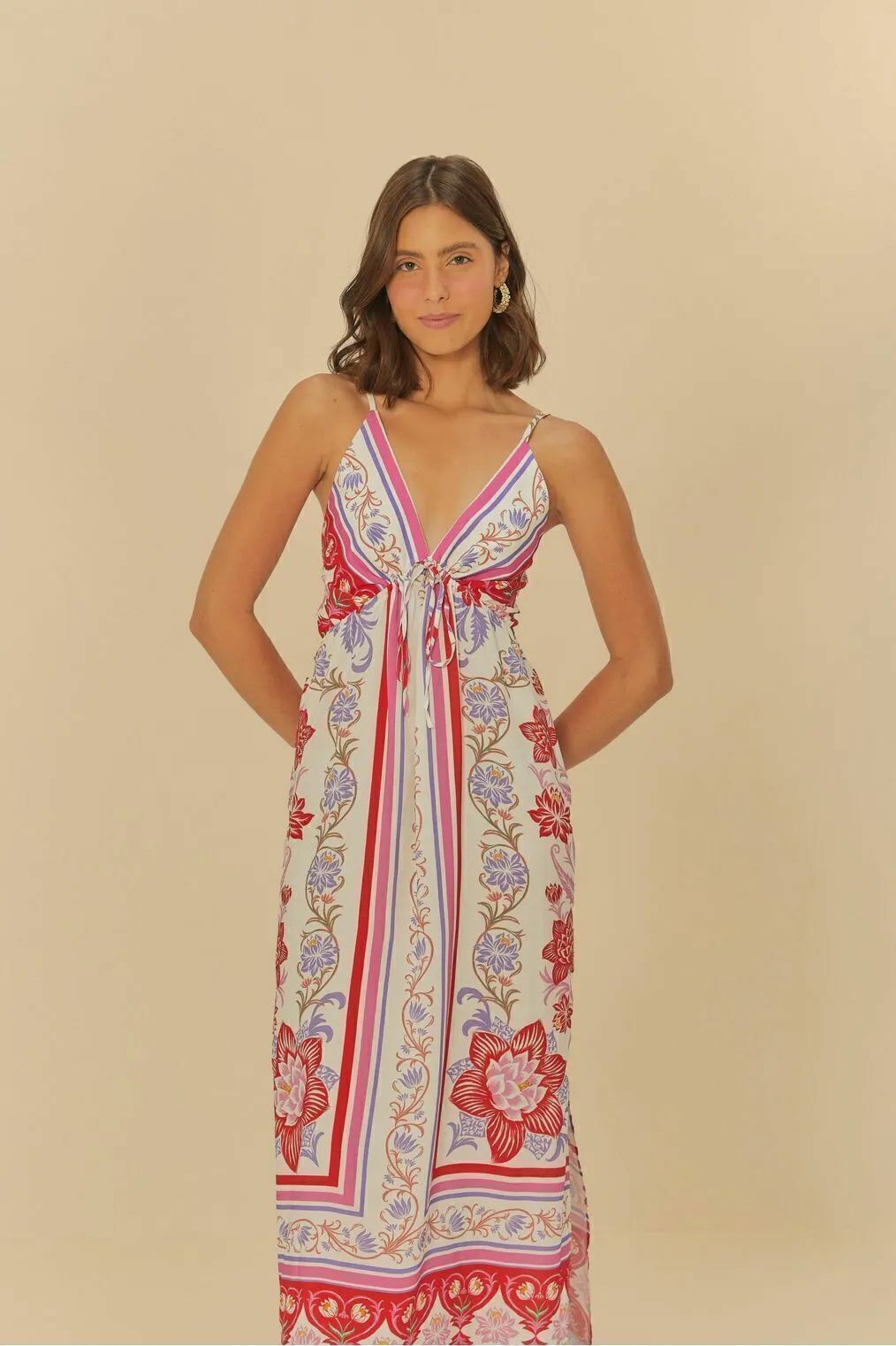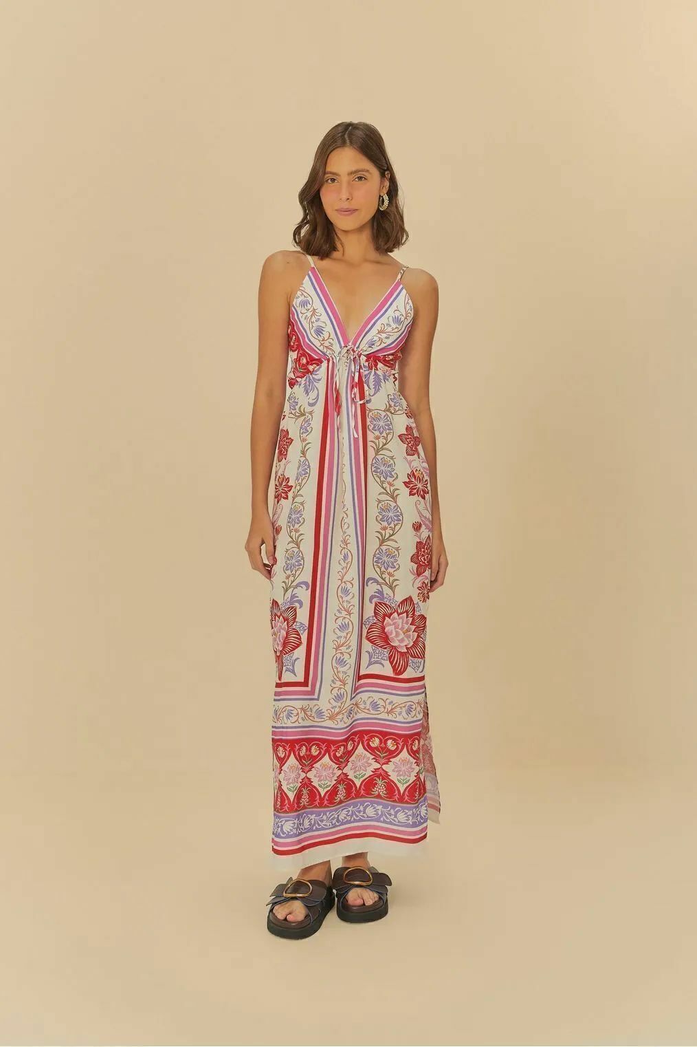 Vestido longo nós estampado lisboa. com decote em v profundo e alças finas, oferece um visual leve e cheio de personalidade. a cintura ajustável destaca a fluidez do corte, enquanto o tecido agradável ao toque garante conforto. perfeito para um passeio casual ou ocasiões especiais. um toque de brasilidade para o seu dia a dia. FARM RIO original - inverno 25.